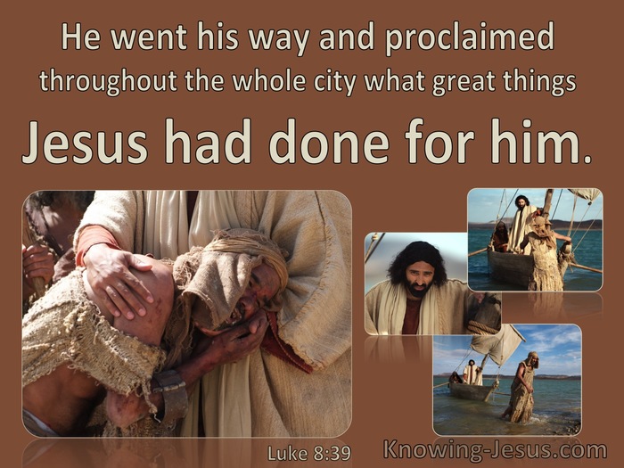 37-39 Later, a great many people from the Gerasene countryside got together and asked Jesus to leave—too much change, too fast, and they were scared. So Jesus got back in the boat and set off. The man whom he had delivered from the demons asked to go with him, but he sent him back, saying, “Go home and tell everything God did in you.” So he went back and preached all over town everything Jesus had done in him.