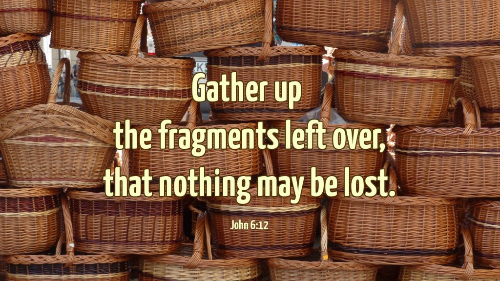 However, I do not hold a candle to Jesus’ invitation to feed thousands who gathered to hear Him speak in the wilderness—away from takeout or grocery stores! The Twelve were asked to be a part of this miracle as they served the people. They each had a basket of fish and bread, blessed by the Master Chef, to hand out to all who gathered in groups. What a holy picnic it was! All had their fill. No one complained. And there were leftovers!! Twelve basketfuls to be exact!
