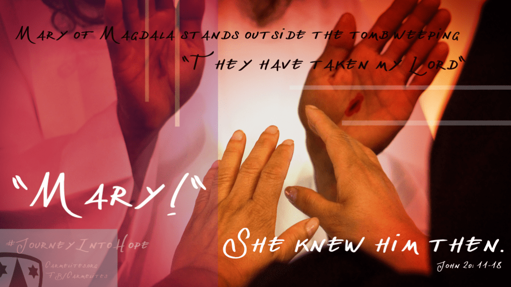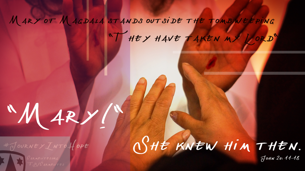 Mary stayed at the last place she saw her Lord—the garden tomb. Still weeping and wondering, she was the first to see Jesus! Jesus was indeed fully alive, risen from death to life, scars, and all! “Go and tell the others, Mary.” She was the first to tell the Good News!