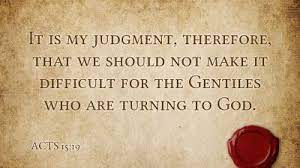 19-21 “So here is my decision: We’re not going to unnecessarily burden non-Jewish people who turn to the Master. We’ll write them a letter and tell them, ‘Be careful to not get involved in activities connected with idols, to guard the morality of sex and marriage, to not serve food offensive to Jewish Christians—blood, for instance.’ This is basic wisdom from Moses, preached and honored for centuries now in city after city as we have met and kept the Sabbath.”
