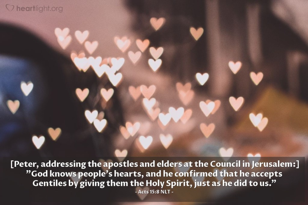 6-9 The apostles and leaders called a special meeting to consider the matter. The arguments went on and on, back and forth, getting more and more heated. Then Peter took the floor: “Friends, you well know that from early on God made it quite plain that he wanted the pagans to hear the Message of this good news and embrace it—and not in any secondhand or roundabout way, but firsthand, straight from my mouth. And God, who can’t be fooled by any pretense on our part but always knows a person’s thoughts, gave them the Holy Spirit exactly as he gave him to us. He treated the outsiders exactly as he treated us, beginning at the very center of who they were and working from that center outward, cleaning up their lives as they trusted and believed him.