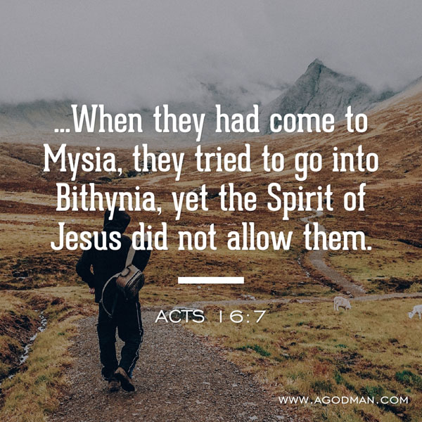6-8 They went to Phrygia, and then on through the region of Galatia. Their plan was to turn west into Asia province, but the Holy Spirit blocked that route. So they went to Mysia and tried to go north to Bithynia, but the Spirit of Jesus wouldn’t let them go there either. Proceeding on through Mysia, they went down to the seaport Troas.