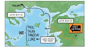 Paul has a mission plan—complete with a map! As he sleeps on his plan, God changes his mind and direction. In obedience to God’s Holy Spirit, Paul traveled to Macedonia to preach Jesus to hungry hearts in need of a Savior. He probably would have done good things with his plan but accomplished greater things with God in the lead. God’s timing, His will, His way is always best.