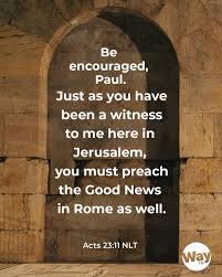 11 That night the Master appeared to Paul: “It’s going to be all right. Everything is going to turn out for the best. You’ve been a good witness for me here in Jerusalem. Now you’re going to be my witness in Rome!”