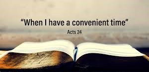24-26 A few days later Felix and his wife, Drusilla, who was Jewish, sent for Paul and listened to him talk about a life of believing in Jesus Christ. As Paul continued to insist on right relations with God and his people, about a life of moral discipline and the coming Judgment, Felix felt things getting a little too close for comfort and dismissed him. “That’s enough for today. I’ll call you back when it’s convenient.” At the same time he was secretly hoping that Paul would offer him a substantial bribe. These conversations were repeated frequently.