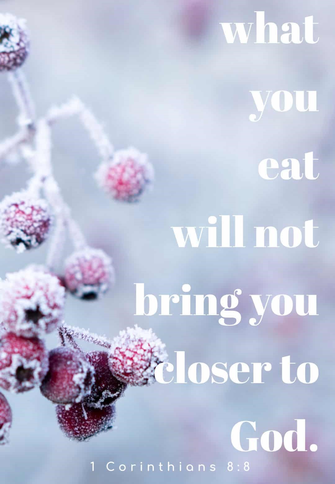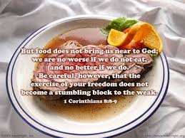 8-9 But fortunately God doesn’t grade us on our diet. We’re neither commended when we clean our plate nor reprimanded when we just can’t stomach it. But God does care when you use your freedom carelessly in a way that leads a fellow believer still vulnerable to those old associations to be thrown off track.