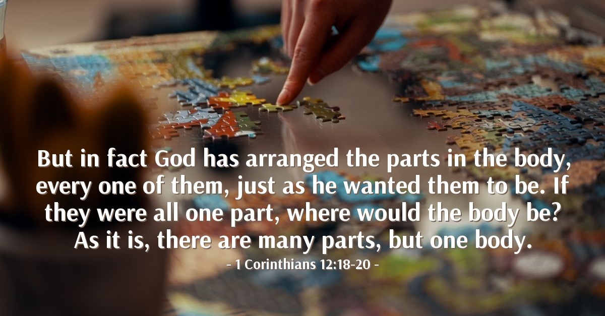 14-18 I want you to think about how all this makes you more significant, not less. A body isn’t just a single part blown up into something huge. It’s all the different-but-similar parts arranged and functioning together. If Foot said, “I’m not elegant like Hand, embellished with rings; I guess I don’t belong to this body,” would that make it so? If Ear said, “I’m not beautiful like Eye, transparent and expressive; I don’t deserve a place on the head,” would you want to remove it from the body? If the body was all eye, how could it hear? If all ear, how could it smell? As it is, we see that God has carefully placed each part of the body right where he wanted it.