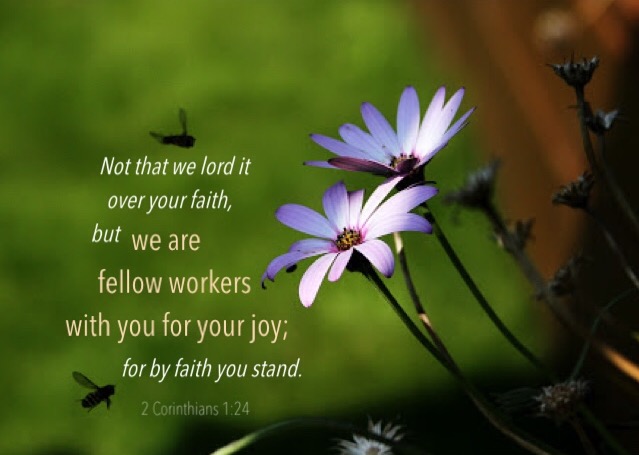 24 We’re not in charge of how you live out the faith, looking over your shoulders, suspiciously critical. We’re partners, working alongside you, joyfully expectant. I know that you stand by your own faith, not by ours.