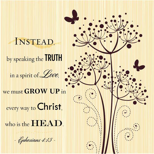 14-16 No prolonged infancies among us, please. We’ll not tolerate babes in the woods, small children who are easy prey for predators. God wants us to grow up, to know the whole truth and tell it in love—like Christ in everything. We take our lead from Christ, who is the source of everything we do. He keeps us in step with each other. His very breath and blood flow through us, nourishing us so that we will grow up healthy in God, robust in love.
