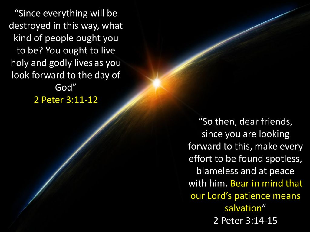 11-13 Since everything here today might well be gone tomorrow, do you see how essential it is to live a holy life? Daily expect the Day of God, eager for its arrival. The galaxies will burn up and the elements melt down that day—but we’ll hardly notice. We’ll be looking the other way, ready for the promised new heavens and the promised new earth, all landscaped with righteousness.