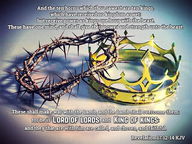 12-14 “The ten horns you saw are ten kings, but they’re not yet in power. They will come to power with the Scarlet Beast, but won’t last long—a very brief reign. These kings will agree to turn over their power and authority to the Beast. They will go to war against the Lamb but the Lamb will defeat them, proof that he is Lord over all lords, King over all kings, and those with him will be the called, chosen, and faithful.”