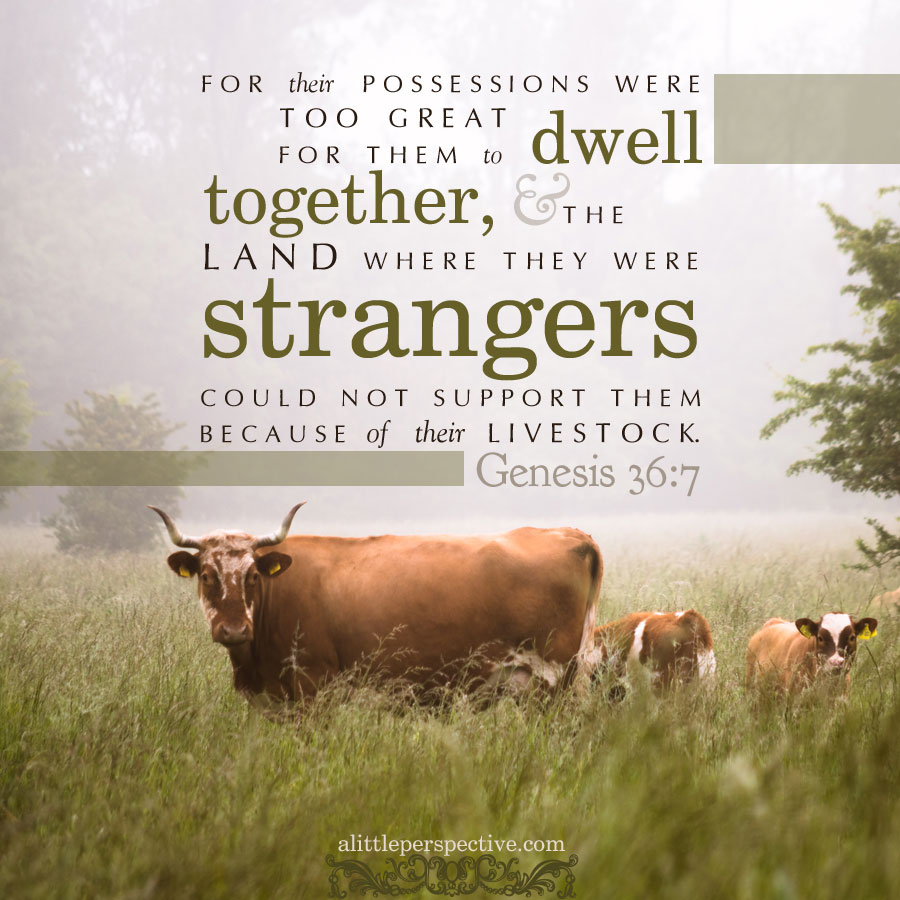 6 Esau took his wives and sons and daughters and all the members of his household, as well as his livestock and all his other animals and all the goods he had acquired in Canaan, and moved to a land some distance from his brother Jacob. 7 Their possessions were too great for them to remain together; the land where they were staying could not support them both because of their livestock. 8 So Esau (that is, Edom) settled in the hill country of Seir.