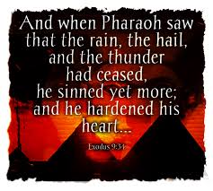 33 Then Moses left Pharaoh and went out of the city. He spread out his hands toward the Lord; the thunder and hail stopped, and the rain no longer poured down on the land. 34 When Pharaoh saw that the rain and hail and thunder had stopped, he sinned again: He and his officials hardened their hearts. 35 So Pharaoh’s heart was hard and he would not let the Israelites go, just as the Lord had said through Moses.
