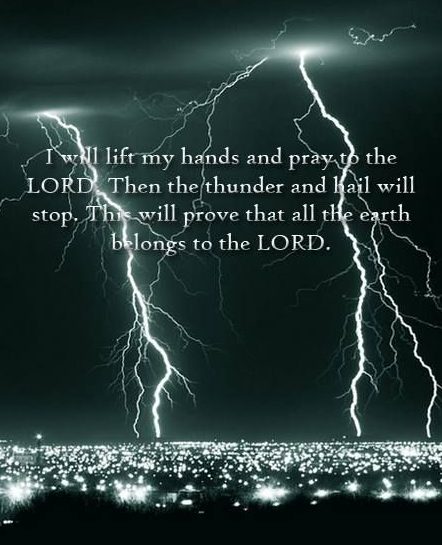 13 Then the Lord said to Moses, “Get up early in the morning, confront Pharaoh and say to him, ‘This is what the Lord, the God of the Hebrews, says: Let my people go, so that they may worship me, 14 or this time I will send the full force of my plagues against you and against your officials and your people, so you may know that there is no one like me in all the earth. 15 For by now I could have stretched out my hand and struck you and your people with a plague that would have wiped you off the earth. 16 But I have raised you up for this very purpose, that I might show you my power and that my name might be proclaimed in all the earth. 17 You still set yourself against my people and will not let them go. 18 Therefore, at this time tomorrow I will send the worst hailstorm that has ever fallen on Egypt, from the day it was founded till now. 19 Give an order now to bring your livestock and everything you have in the field to a place of shelter, because the hail will fall on every person and animal that has not been brought in and is still out in the field, and they will die.’”