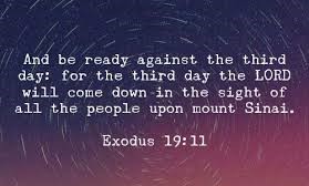 God is coming down from His throne in heaven to speak so all will be able to hear Him. Moses is to tell the people to get ready by washing off the daily dust of the desert, stopping their daily tasks, as ways to get ready to hear what He has to say. God will appear to them on the third day.