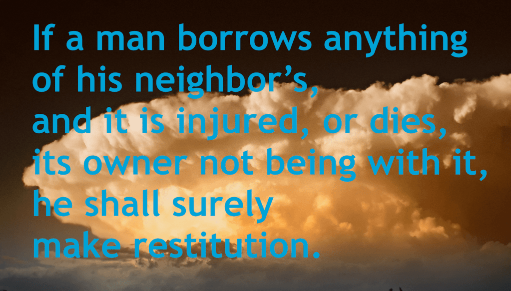 “Anyone who steals must certainly make restitution, but if they have nothing, they must be sold to pay for their theft. 4 If the stolen animal is found alive in their possession—whether ox or donkey or sheep—they must pay back double.