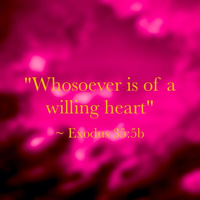 God calls. God equips. God sends. God fills the souls of men and women whose hearts are willing and obedient with His Holy Spirit. God could have most certainly waved His hand over the wilderness sojourners to provide a tent of meeting for Himself; but instead He chose men and women with special skills, wisdom, and abilities to not only do the work but teach others the work. God is teaching His People how to give Him glory in all areas of their lives! It’s not about the task itself; it’s about God. It is God who is inviting us to JOIN Him in His work! What an awesome opportunity! THIS is what the “willing people” throughout this passage are driven by—God’s invitation!