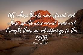 20 Then the whole Israelite community withdrew from Moses’ presence, 21 and everyone who was willing and whose heart moved them came and brought an offering to the Lord for the work on the tent of meeting, for all its service, and for the sacred garments. 22 All who were willing, men and women alike, came and brought gold jewelry of all kinds: brooches, earrings, rings and ornaments. They all presented their gold as a wave offering to the Lord. 23 Everyone who had blue, purple or scarlet yarn or fine linen, or goat hair, ram skins dyed red or the other durable leather brought them. 24 Those presenting an offering of silver or bronze brought it as an offering to the Lord, and everyone who had acacia wood for any part of the work brought it. 25 Every skilled woman spun with her hands and brought what she had spun—blue, purple or scarlet yarn or fine linen. 26 And all the women who were willing and had the skill spun the goat hair. 27 The leaders brought onyx stones and other gems to be mounted on the ephod and breastpiece. 28 They also brought spices and olive oil for the light and for the anointing oil and for the fragrant incense. 29 All the Israelite men and women who were willing brought to the Lord freewill offerings for all the work the Lord through Moses had commanded them to do.