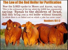 The Lord said to Moses and Aaron: 2 “This is a requirement of the law that the Lord has commanded: Tell the Israelites to bring you a red heifer without defect or blemish and that has never been under a yoke. 3 Give it to Eleazar the priest; it is to be taken outside the camp and slaughtered in his presence. 4 Then Eleazar the priest is to take some of its blood on his finger and sprinkle it seven times toward the front of the tent of meeting. 5 While he watches, the heifer is to be burned—its hide, flesh, blood and intestines. 6 The priest is to take some cedar wood, hyssop and scarlet wool and throw them onto the burning heifer. 7 After that, the priest must wash his clothes and bathe himself with water. He may then come into the camp, but he will be ceremonially unclean till evening. 8 The man who burns it must also wash his clothes and bathe with water, and he too will be unclean till evening.