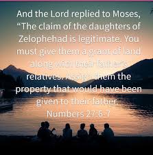 5 So Moses brought their case before the Lord, 6 and the Lord said to him, 7 “What Zelophehad’s daughters are saying is right. You must certainly give them property as an inheritance among their father’s relatives and give their father’s inheritance to them.