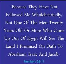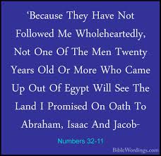 6 Moses said to the Gadites and Reubenites, “Should your fellow Israelites go to war while you sit here? 7 Why do you discourage the Israelites from crossing over into the land the Lord has given them? 8 This is what your fathers did when I sent them from Kadesh Barnea to look over the land. 9 After they went up to the Valley of Eshkol and viewed the land, they discouraged the Israelites from entering the land the Lord had given them. 10 The Lord’s anger was aroused that day and he swore this oath: 11 ‘Because they have not followed me wholeheartedly, not one of those who were twenty years old or more when they came up out of Egypt will see the land I promised on oath to Abraham, Isaac and Jacob— 12 not one except Caleb son of Jephunneh the Kenizzite and Joshua son of Nun, for they followed the Lord wholeheartedly.’ 13 The Lord’s anger burned against Israel and he made them wander in the wilderness forty years, until the whole generation of those who had done evil in his sight was gone.