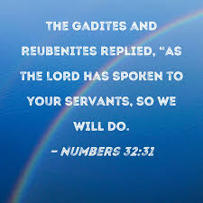 25 The Gadites and Reubenites said to Moses, “We your servants will do as our lord commands. 26 Our children and wives, our flocks and herds will remain here in the cities of Gilead. 27 But your servants, every man who is armed for battle, will cross over to fight before the Lord, just as our lord says.”