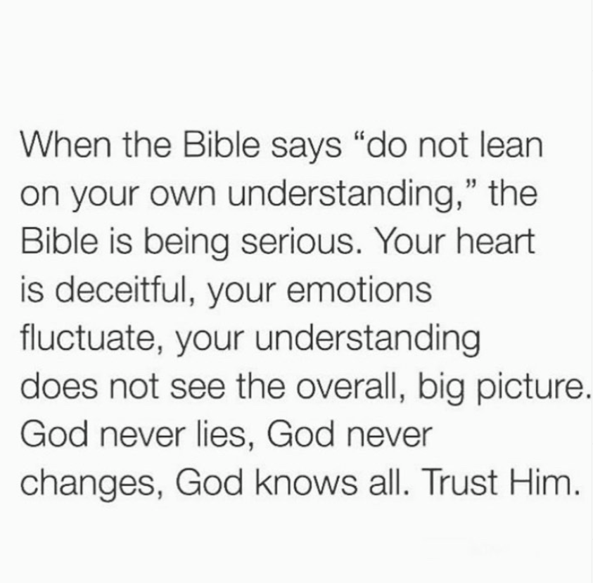“Trust in the Lord with all your heart and lean not on your own understanding; in all your ways submit to him, and he will make your paths straight.” Proverbs 3:5-6, NIV