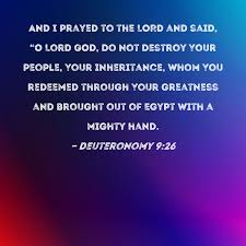 25 I lay prostrate before the Lord those forty days and forty nights because the Lord had said he would destroy you. 26 I prayed to the Lord and said, “Sovereign Lord, do not destroy your people, your own inheritance that you redeemed by your great power and brought out of Egypt with a mighty hand. 27 Remember your servants Abraham, Isaac and Jacob. Overlook the stubbornness of this people, their wickedness and their sin. 28 Otherwise, the country from which you brought us will say, ‘Because the Lord was not able to take them into the land he had promised them, and because he hated them, he brought them out to put them to death in the wilderness.’ 29 But they are your people, your inheritance that you brought out by your great power and your outstretched arm.”