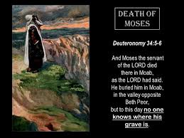 5 And Moses the servant of the Lord died there in Moab, as the Lord had said. 6 He buried him in Moab, in the valley opposite Beth Peor, but to this day no one knows where his grave is. 7 Moses was a hundred and twenty years old when he died, yet his eyes were not weak nor his strength gone. 8 The Israelites grieved for Moses in the plains of Moab thirty days, until the time of weeping and mourning was over.