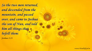 23-24 The men headed back. They came down out of the hills, crossed the river, and returned to Joshua son of Nun and reported all their experiences. They told Joshua, “Yes! God has given the whole country to us. Everybody there is in a state of panic because of us.”