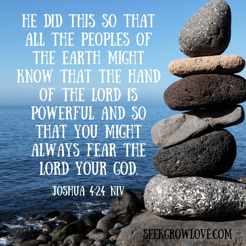 19 On the tenth day of the first month the people went up from the Jordan and camped at Gilgal on the eastern border of Jericho. 20 And Joshua set up at Gilgal the twelve stones they had taken out of the Jordan. 21 He said to the Israelites, “In the future when your descendants ask their parents, ‘What do these stones mean?’ 22 tell them, ‘Israel crossed the Jordan on dry ground.’ 23 For the Lord your God dried up the Jordan before you until you had crossed over. The Lord your God did to the Jordan what he had done to the Red Sea when he dried it up before us until we had crossed over. 24 He did this so that all the peoples of the earth might know that the hand of the Lord is powerful and so that you might always fear the Lord your God.”