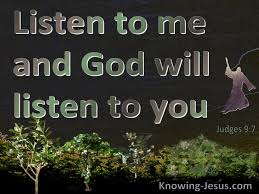 When Jotham was told about this, he climbed up on the top of Mount Gerizim and shouted to them, “Listen to me, citizens of Shechem, so that God may listen to you. 8One day the trees went out to anoint a king for themselves. They said to the olive tree, ‘Be our king.’