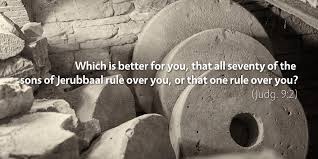 Gideon (Jerub-Baal) produced seventy sons with various wives, including one in particular from his female slave.  This son, Abimelek did not follow Gideon’s love and devoted service to God.  Abimelek was a conniving, devious, power seeker. Jotham, the youngest son of the clan, stood for what was right in the eyes of God—like his father.  Here is their story of how God intervenes when evil persists to destroy.