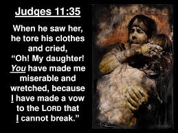 34 When Jephthah returned to his home in Mizpah, who should come out to meet him but his daughter, dancing to the sound of timbrels! She was an only child. Except for her he had neither son nor daughter. 35 When he saw her, he tore his clothes and cried, “Oh no, my daughter! You have brought me down and I am devastated. I have made a vow to the Lord that I cannot break.”