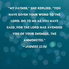 36 “My father,” she replied, “you have given your word to the Lord. Do to me just as you promised, now that the Lord has avenged you of your enemies, the Ammonites. 37 But grant me this one request,” she said. “Give me two months to roam the hills and weep with my friends, because I will never marry.”