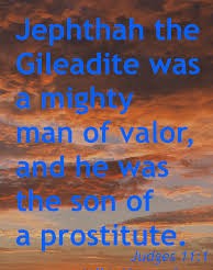 Jephthah was yet another unlikely candidate chosen to save Israel from the consequences of their own sins of betraying God in the worship of the gods of unbelievers. He was the unwanted son of a prostitute and Gilead. Gilead tried to make him a member of his family but this son would have no inheritance. The other members of his family rejected and humiliated him and sent him packing. Jephthah moved to Tob.