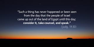 29 When he reached home, he took a knife and cut up his concubine, limb by limb, into twelve parts and sent them into all the areas of Israel. 30 Everyone who saw it was saying to one another, “Such a thing has never been seen or done, not since the day the Israelites came up out of Egypt. Just imagine! We must do something! So speak up!”