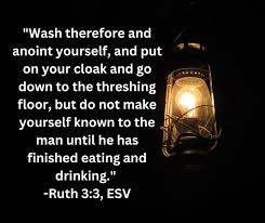 “She was to put off the garments of a sorrowing widow and dress for a wedding (Isaiah 61:1–3). Ruth probably didn’t have a large wardrobe, but she would have one special garment for festive occasions. Naomi had the faith to believe that Ruth would soon be going to a wedding! Salvation is pictured as a change of clothes (Luke 15:22; see also Isaiah 61:10), and Christian living means taking off the “grave clothes” of the old life and putting on the “grace clothes” of the new life (Col. 3:1–17; John 11:44). We can’t come into God’s presence in our own righteousness, for “all our righteousnesses are like filthy rags” (Isaiah 64:6). We can only come in the righteousness of Jesus Christ (2 Corinthians 5:21), “by which He made us accepted in the Beloved” (Ephesians. 1:6)—Wiersbe Study Bible