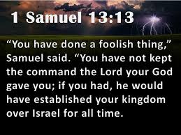 13 “You have done a foolish thing,” Samuel said. “You have not kept the command the Lord your God gave you; if you had, he would have established your kingdom over Israel for all time. 14 But now your kingdom will not endure; the Lord has sought out a man after his own heart and appointed him ruler of his people, because you have not kept the Lord’s command.”