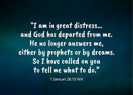 I think of what Jesus said as we learn the predicament Saul is in. God removed His Spirit from King Saul when Saul arrogantly refused to obey God. The outcome of this broken relationship with God has resulted in leaving Saul with living with the consequences of his own rebellious actions. Saul is now left to his own devices in every part of his life. Earlier, Saul thought he didn’t need God. In fact, he declared himself a god! So, is it any wonder Saul no longer hears from the God?
