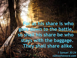 23 David replied, “No, my brothers, you must not do that with what the Lord has given us. He has protected us and delivered into our hands the raiding party that came against us. 24 Who will listen to what you say? The share of the man who stayed with the supplies is to be the same as that of him who went down to the battle. All will share alike.” 25 David made this a statute and ordinance for Israel from that day to this.