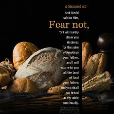 7 “Don’t be afraid,” David said to him, “for I will surely show you kindness for the sake of your father Jonathan. I will restore to you all the land that belonged to your grandfather Saul, and you will always eat at my table.”