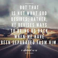13 The woman said, “Why then have you devised a thing like this against the people of God? When the king says this, does he not convict himself, for the king has not brought back his banished son? 14 Like water spilled on the ground, which cannot be recovered, so we must die. But that is not what God desires; rather, he devises ways so that a banished person does not remain banished from him.