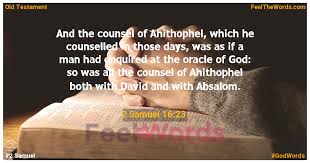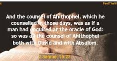 “Absalom looked to human experience and wisdom—and from a human point of view, Ahithophel was among the very best. Ahithophel didn’t seek the mind of the Lord, however, nor did he want the will of the Lord. His primary goal was to avenge himself against David for the sin David had committed against his granddaughter Bathsheba and her husband, Uriah the Hittite. The depravity and triumphs of sin may shock us, but they cannot defeat the plans or purposes of God.” –Wiersbe Study Bible