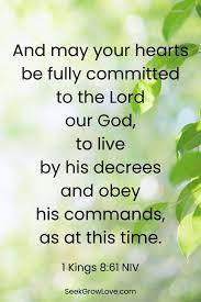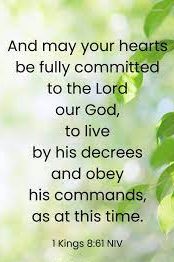 56 “Praise be to the Lord, who has given rest to his people Israel just as he promised. Not one word has failed of all the good promises he gave through his servant Moses. 57 May the Lord our God be with us as he was with our ancestors; may he never leave us nor forsake us. 58 May he turn our hearts to him, to walk in obedience to him and keep the commands, decrees and laws he gave our ancestors. 59 And may these words of mine, which I have prayed before the Lord, be near to the Lord our God day and night, that he may uphold the cause of his servant and the cause of his people Israel according to each day’s need, 60 so that all the peoples of the earth may know that the Lord is God and that there is no other. 61 And may your hearts be fully committed to the Lord our God, to live by his decrees and obey his commands, as at this time.”
