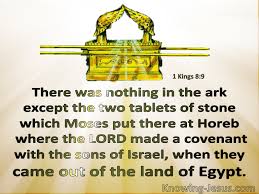 6 The priests then brought the ark of the Lord’s covenant to its place in the inner sanctuary of the temple, the Most Holy Place, and put it beneath the wings of the cherubim. 7 The cherubim spread their wings over the place of the ark and overshadowed the ark and its carrying poles. 8 These poles were so long that their ends could be seen from the Holy Place in front of the inner sanctuary, but not from outside the Holy Place; and they are still there today. 9 There was nothing in the ark except the two stone tablets that Moses had placed in it at Horeb, where the Lord made a covenant with the Israelites after they came out of Egypt.
