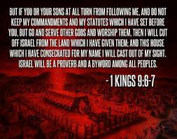 6 “But if you or your descendants turn away from me and do not observe the commands and decrees I have given you and go off to serve other gods and worship them, 7 then I will cut off Israel from the land I have given them and will reject this temple I have consecrated for my Name. Israel will then become a byword and an object of ridicule among all peoples. 8 This temple will become a heap of rubble. All who pass by will be appalled and will scoff and say, ‘Why has the Lord done such a thing to this land and to this temple?’ 9 People will answer, ‘Because they have forsaken the Lord their God, who brought their ancestors out of Egypt, and have embraced other gods, worshiping and serving them—that is why the Lord brought all this disaster on them.’”