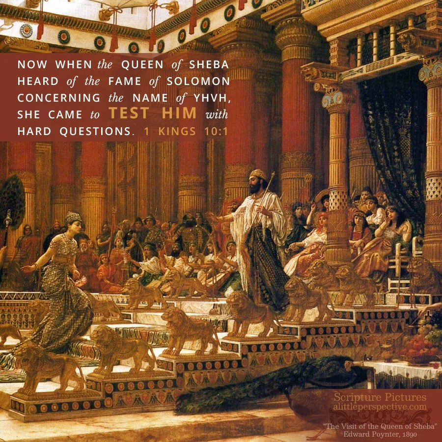 When the queen of Sheba heard about the fame of Solomon and his relationship to the Lord, she came to test Solomon with hard questions. 2 Arriving at Jerusalem with a very great caravan—with camels carrying spices, large quantities of gold, and precious stones—she came to Solomon and talked with him about all that she had on her mind. 3 Solomon answered all her questions; nothing was too hard for the king to explain to her. 4 When the queen of Sheba saw all the wisdom of Solomon and the palace he had built, 5 the food on his table, the seating of his officials, the attending servants in their robes, his cupbearers, and the burnt offerings he made at the temple of the Lord, she was overwhelmed.
