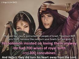 King Solomon, however, loved many foreign women besides Pharaoh’s daughter—Moabites, Ammonites, Edomites, Sidonians and Hittites. 2 They were from nations about which the Lord had told the Israelites, “You must not intermarry with them, because they will surely turn your hearts after their gods.” Nevertheless, Solomon held fast to them in love. 3 He had seven hundred wives of royal birth and three hundred concubines, and his wives led him astray. 4 As Solomon grew old, his wives turned his heart after other gods, and his heart was not fully devoted to the Lord his God, as the heart of David his father had been. 5He followed Ashtoreth the goddess of the Sidonians, and Molek the detestable god of the Ammonites. 6 So Solomon did evil in the eyes of the Lord; he did not follow the Lord completely, as David his father had done.