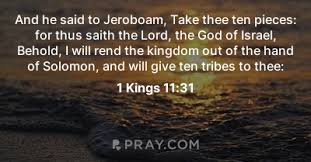 29 About that time Jeroboam was going out of Jerusalem, and Ahijah the prophet of Shiloh met him on the way, wearing a new cloak. The two of them were alone out in the country, 30 and Ahijah took hold of the new cloak he was wearing and tore it into twelve pieces. 31 Then he said to Jeroboam, “Take ten pieces for yourself, for this is what the Lord, the God of Israel, says: ‘See, I am going to tear the kingdom out of Solomon’s hand and give you ten tribes. 32 But for the sake of my servant David and the city of Jerusalem, which I have chosen out of all the tribes of Israel, he will have one tribe. 33 I will do this because they have forsaken me and worshiped Ashtoreth the goddess of the Sidonians, Chemosh the god of the Moabites, and Molek the god of the Ammonites, and have not walked in obedience to me, nor done what is right in my eyes, nor kept my decrees and laws as David, Solomon’s father, did.
